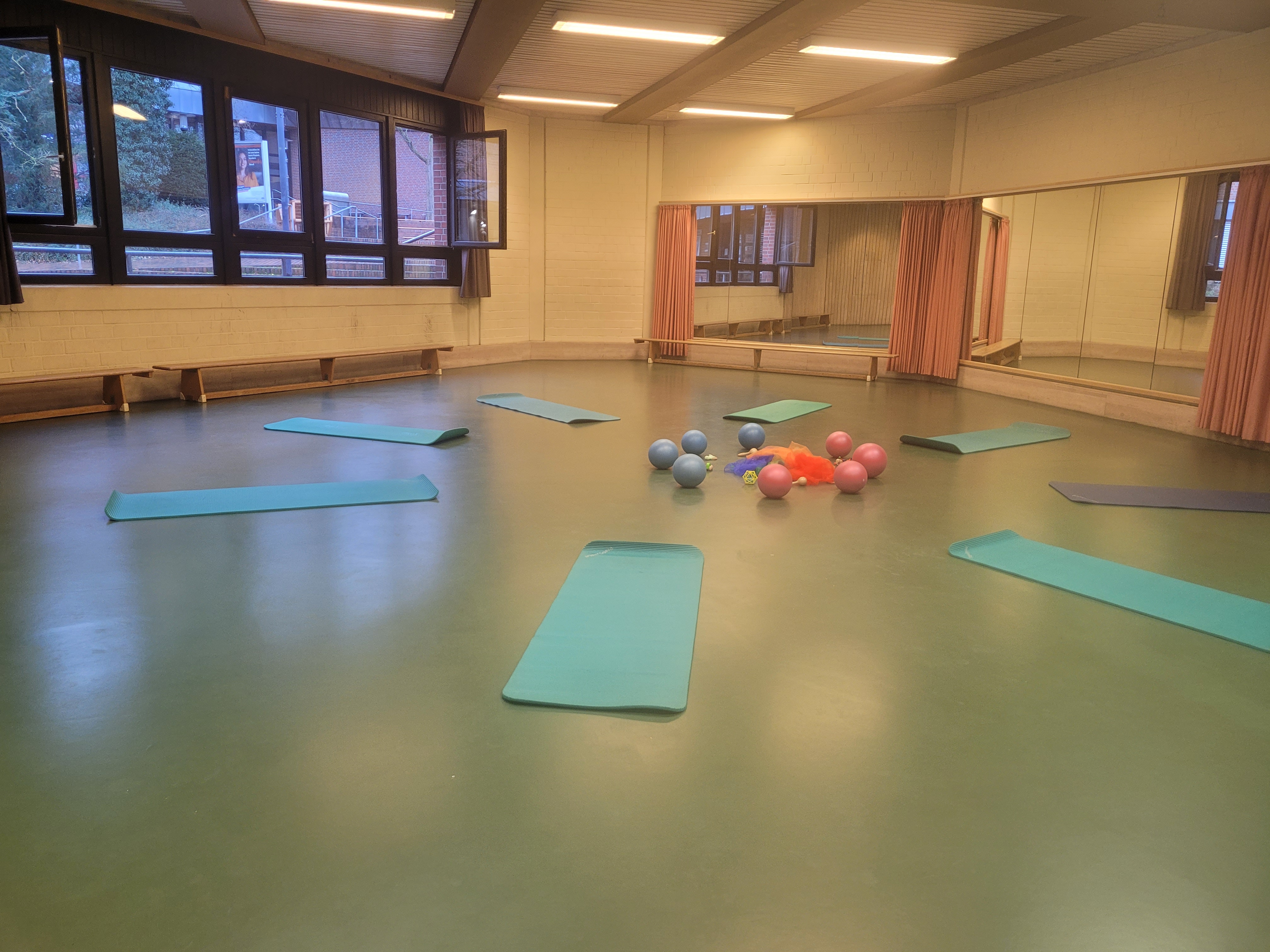 Ein Tanzspiegel unterstützt die Wahrnehmung und Bewegungsfreude während des Kurses.
